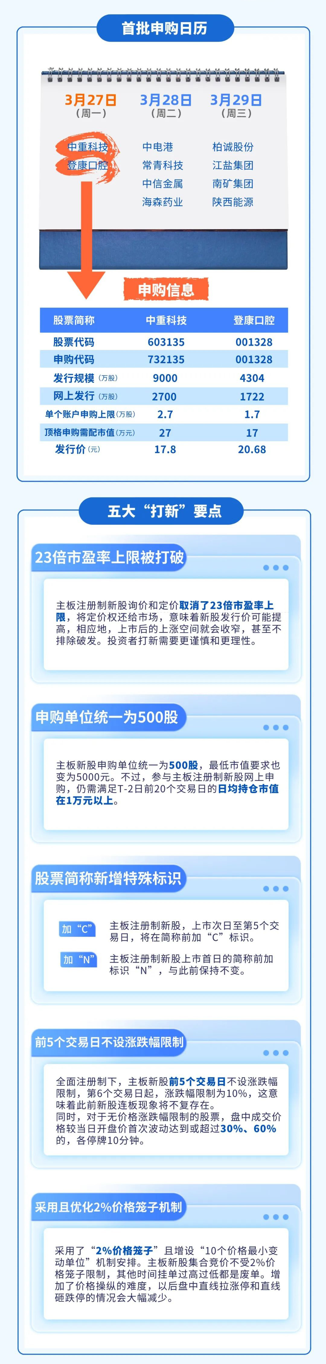 首批10只主板注册制新股,中重科技、登康口腔将在周一(3月27日)申购;中电港、常青科技、中信金属、海森药业将在周二(3月28日)申购;柏诚股份、江盐集团、南矿集团、陕西能源将在周三(3月29日)申购。
