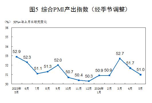 5月份,综合PMI产出指数为51.0%,比上月下降0.7个百分点,继续高于临界点,表明我国企业生产经营活动总体保持恢复发展态势。