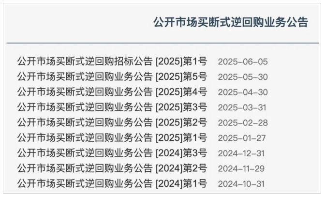 6月5日,央行发布公告,“为保持银行体系流动性充裕,2025年6月6日,中国人民银行将以固定数量、利率招标、多重价位中标方式开展10000亿元买断式逆回购操作,期限为3个月(91天)”。